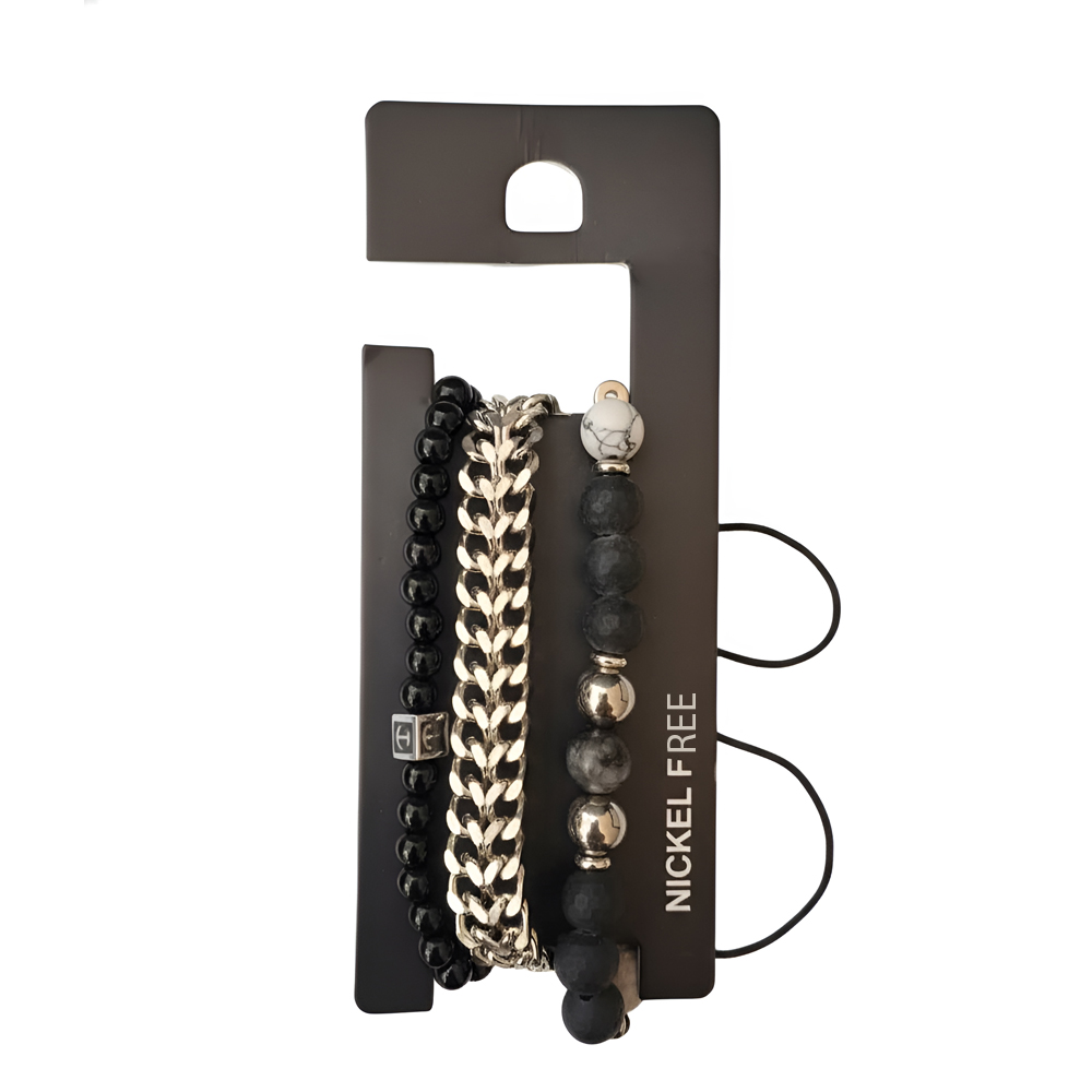 این دستبند مردانه در اصل سه دستبند مجزا هستند که همه رو با هم با این قیمت تقدیم می کنیم. اینکار بدون نیکل است پس ضد حساسیت و کیفیت بالای محصول یه اثر دلچسب از اون ساخته. این طرح با ترکیب یک دستبند استیل بسیار شکیل هست.